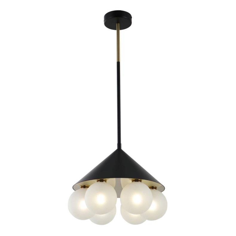 Као практичар Милана Еуролуце Тренд осветљења, снажно осветљење професионалног дизајнерског тима инфузирао је концепт геометријског у овом Г9 сијалицом са 6-светлосним лампицама. Конична метална база формирана је коришћењем ласерске технологије сечења и третирана и са мат црном прашкастом премазом и месингом електроплитацијом, што приказује равнотежу између индустријске естетике и додир луксуза. Висока сфера са шест смрзаних стаклених стакленика суспендована је изнад сваке карактеристике прецизно јетљено утора. Када је 5В Г9 топло светло пролази кроз стакло дебљине 8 мм, ствара изразити слојеви олово светлости и сенке.
